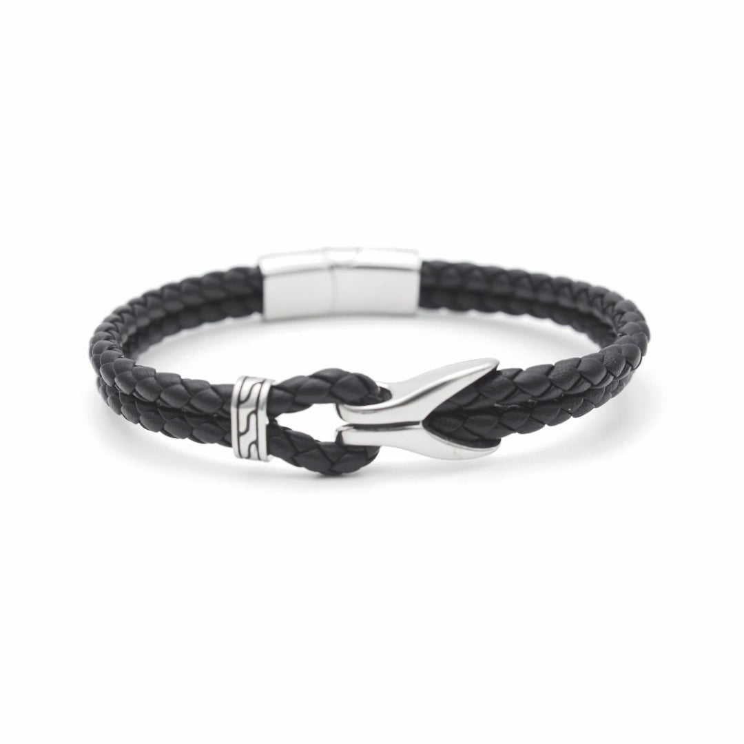 A bracelet that combines a modern style with a nautical spirit. The double braided leather in black conveys freshness and authenticity, while the anchor-shaped detail in 316L steel and the magnetic clasp enhance its elegant and contemporary design. Created for the man who seeks to project confidence and personality, this piece becomes the perfect accessory to stand out with a distinctive touch on any occasion.