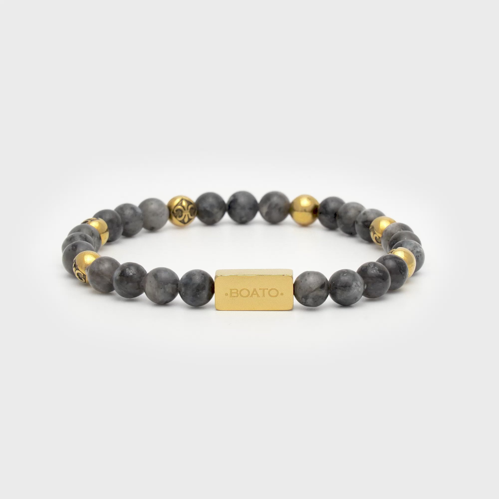 A bracelet that conveys strength, character, and distinction. The labradorite stones reflect energy and resilience, while the details in 316L steel with PVD gold-plated spheres and fleur-de-lis accents add a touch of sophistication and accessible luxury. Designed for the man who seeks a powerful and elegant accessory, this piece becomes the ideal complement to project confidence and personality in every moment.