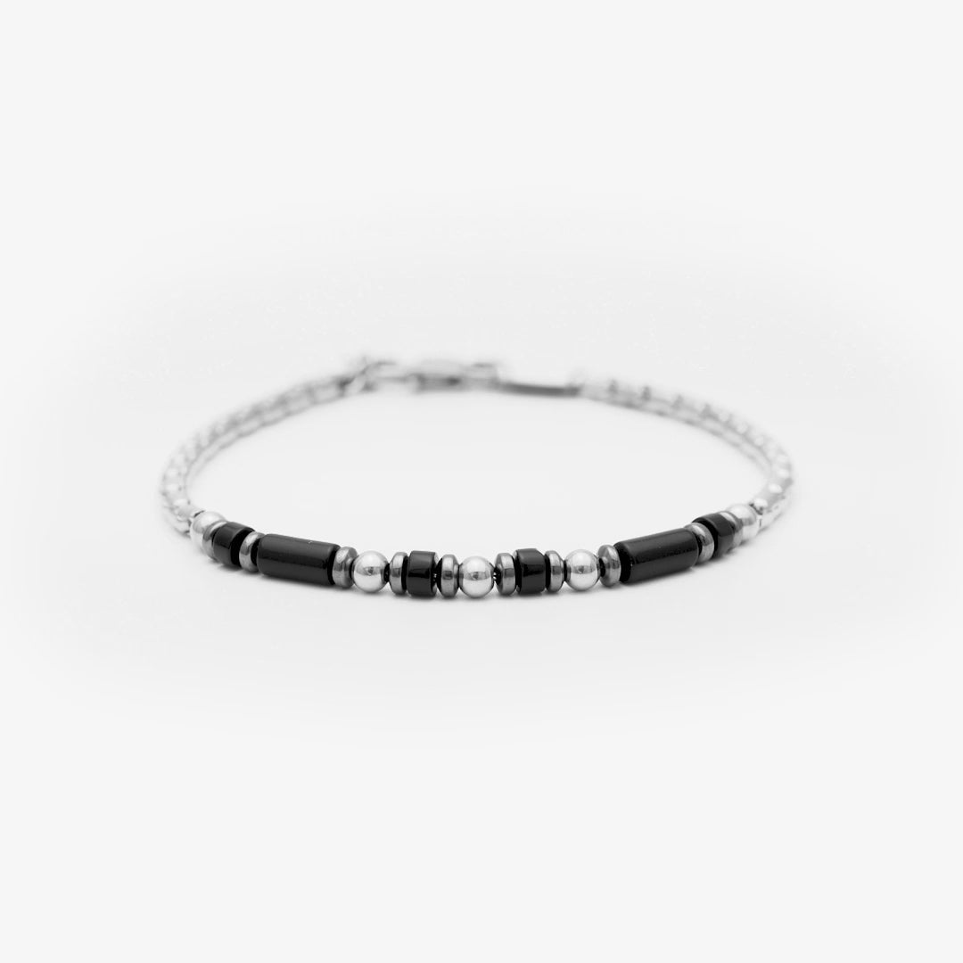 This bracelet represents a balance between sophistication and natural energy. Its onyx beads, known for their deep dark color, evoke a unique and mysterious style. The delicate combination with metallic shine creates a minimalist yet characterful design, ideal for men who want to project confidence and a modern style with a spiritual touch. Its light and elegant design makes it a versatile piece for daily wear or special occasions.