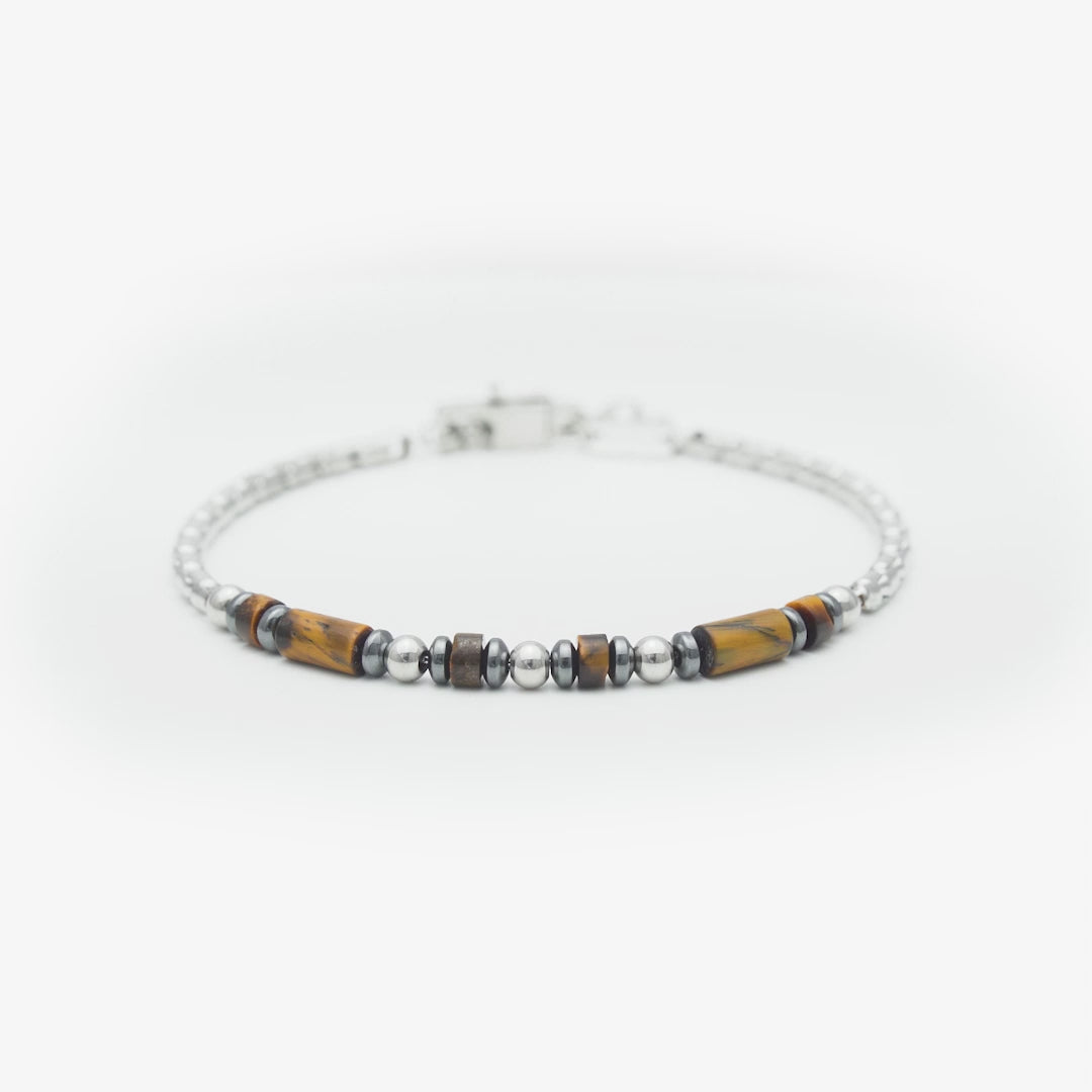 Additional material: Natural tiger’s eye stones in cylindrical cuts, combined with polished metallic beads.