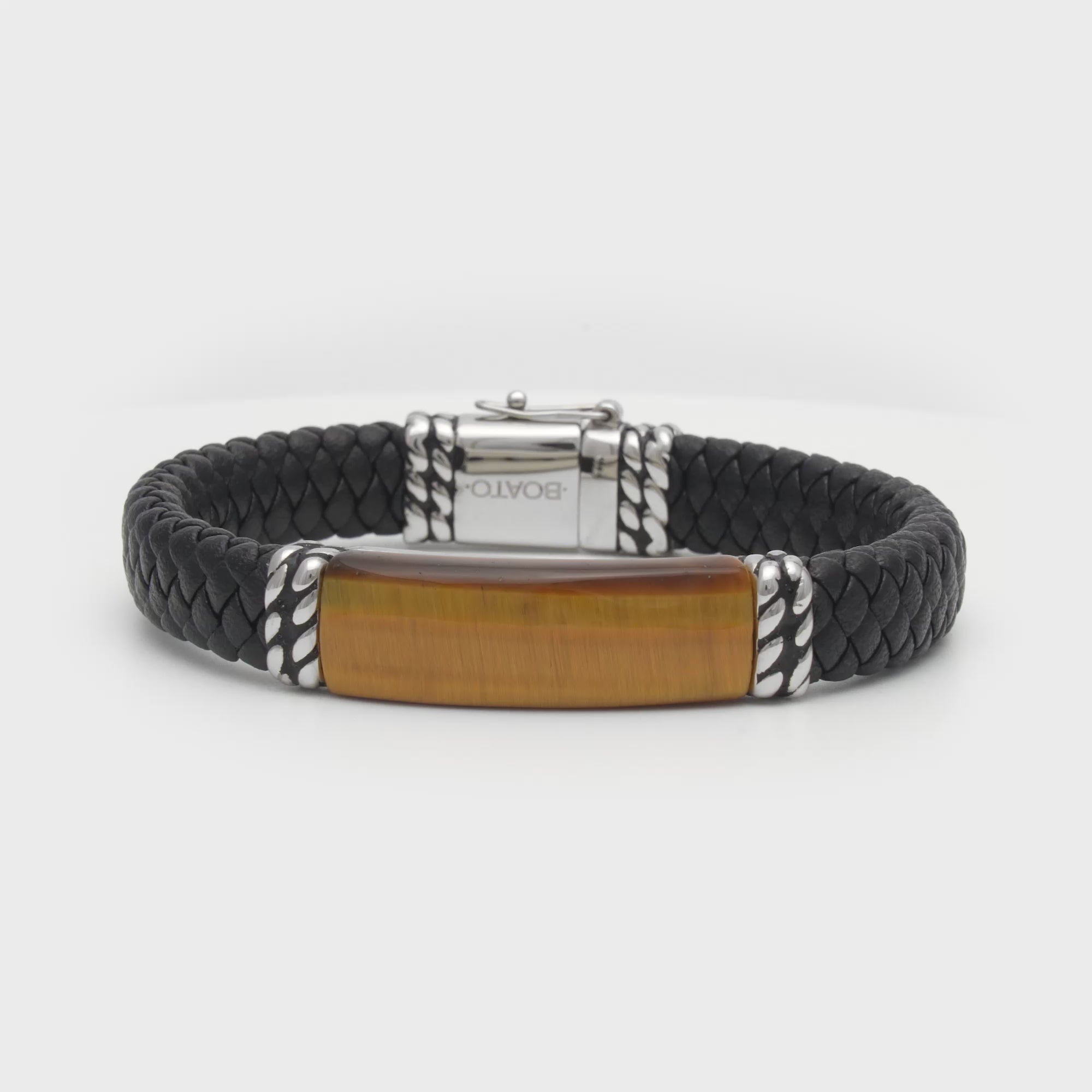 A bracelet that combines natural strength with contemporary elegance. The black braided leather adds character and versatility, while the natural stone (eye tiger) center bar, accented by 316L steel details, conveys authenticity and distinction. Created for the man seeking a unique and modern accessory, this piece exudes confidence, personality, and timeless style.
