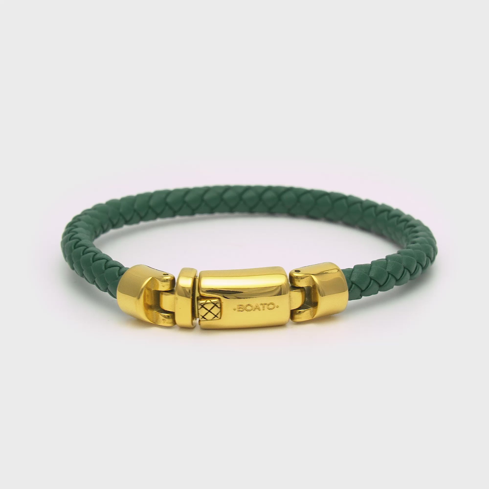 An accessory that inspires distinction and confidence. This bracelet combines the sober character of green braided leather with the elegant shine of its gold-finished stainless steel clasp. Designed for men who value details, it doesn’t just complement your style it projects authenticity and sophistication. Wearing it becomes a symbol of your essence: elegant, determined, and full of character.