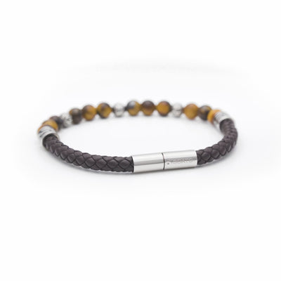 A fusion of strength and sophistication crafted for the modern man. The braided leather symbolizes character and resilience, while the eye tiger stones evoke mystery and elegance. 316L steel beads with geometric engravings add a distinctive touch, making it a piece that conveys confidence, style, and a unique personality.
