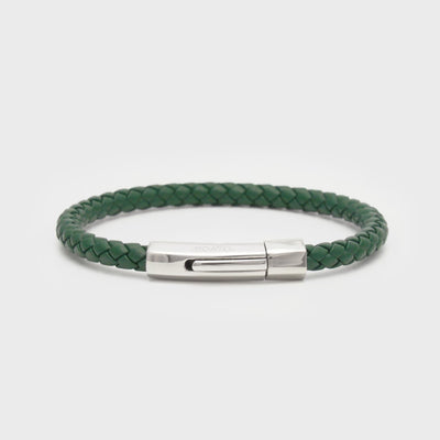 A bracelet that combines simplicity with a modern style. The braided green leather conveys freshness and authenticity, while the 316L steel hook clasp adds a touch of contemporary elegance. Designed for the man who values subtle details, this piece becomes a versatile accessory that projects confidence, character, and distinction on any occasion.