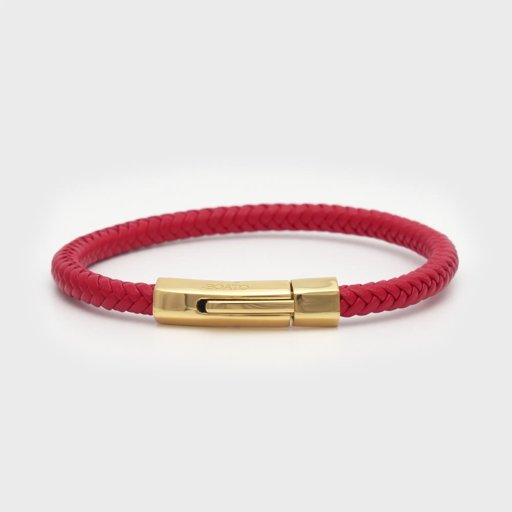 A bracelet that conveys energy, passion, and sophistication. The vibrant red braided leather reflects strength and determination, while the gold-finished 316L steel magnetic clasp enhances its modern and elegant character. Designed for the man who seeks to stand out with confidence, this piece becomes a bold accessory that projects personality and style on every occasion.