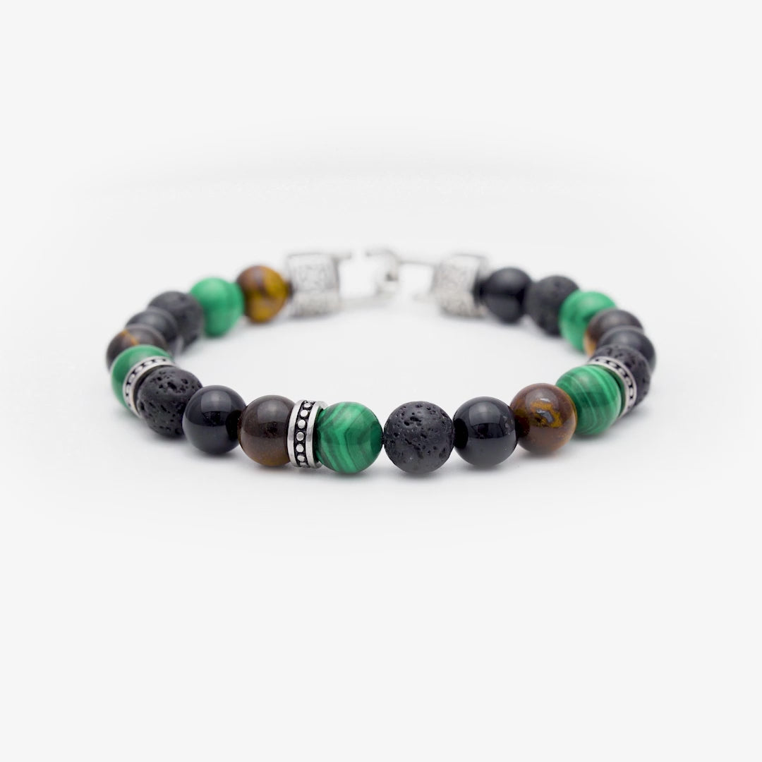 A fusion of strength, balance, and style is reflected in this unique bracelet. Each stone — from the vibrant green of malachite to the depth of onyx and the warm energy of tiger’s eye — conveys character and authenticity. The metallic details enhance its handcrafted design, while the volcanic stones add a grounding connection to the earth. This is a piece designed for men who want to express their personality with a distinctive accessory full of visual power and meaning.